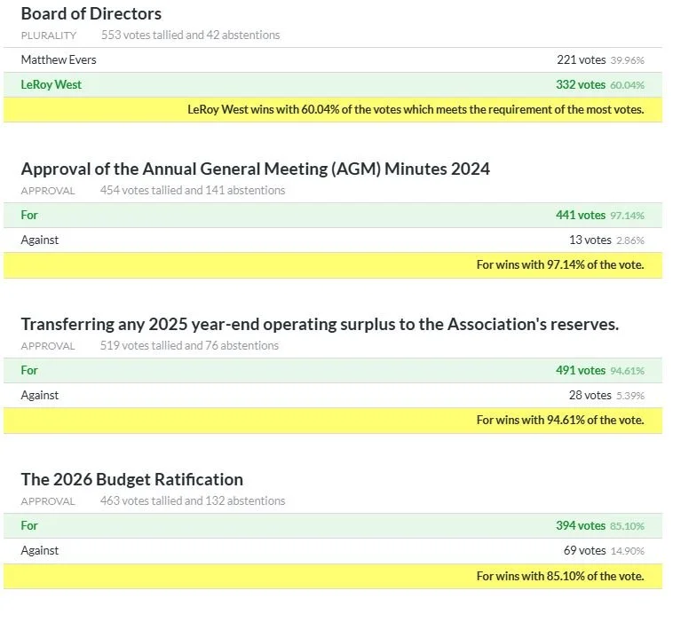 2025 Board of Directors Election Board of Directors Transfer 2025 year-end operating surplus to reserves 2026 Budget Ratification Approve 2024 AGM Minutes Statement of Financials Approved 2026 Budget